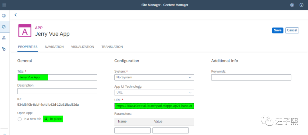 进入 SAP BTP Site Manager,创建一个新的 Site 和新的应用,将 Vue 应用的 URL 维护到该应用 URL 字段内。