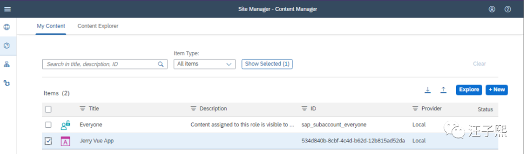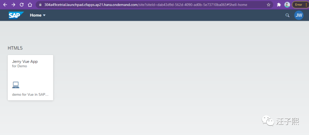 最终,打开我们创建好的 Site,能看到一个 Fiori Launchpad,包含了一个 tile,指向我们之前在 SAP Business Application Studio 里创建的 Vue 应用: