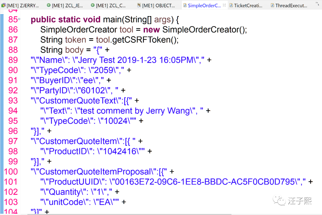 OData 协议基于 HTTP,在使用 OData 服务执行业务数据的创建或者修改时,需要编程人员在 HTTP 层面操作 POST 请求的 body 内容,步骤繁琐且容易出错。比如下图是 Jerry 2019 年一个项目中用 Java 调用 SAP C4C OData 服务创建销售订单的测试代码片段,其中第88行变量 body,包含的就是手动拼接 HTTP Post 请求的负载内容,可读性很差且不易维护。