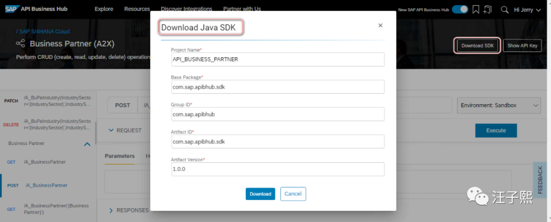 目前 S/4HANA Cloud SDK 支持 Java 和 JavaScript 两种编程语言。在 SAP API Business Hub 上,我们可以下载 Java 版本的 SDK: