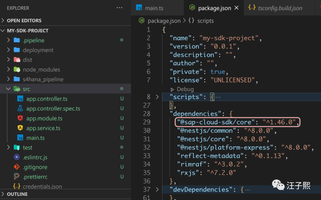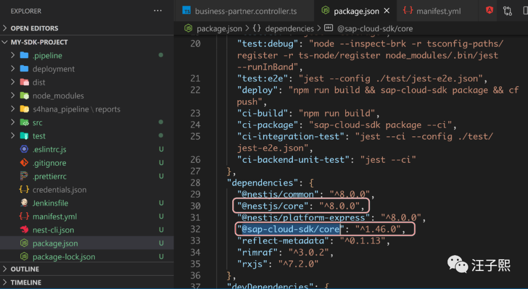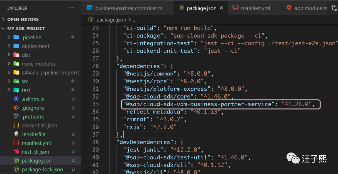 package.json 文件定义的依赖,除了 sap-cloud-sdk 本身外,还包括 nestjs, 这是一个用于构建高效且可扩展的 Node.js 服务器端应用的开发框架。