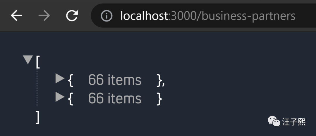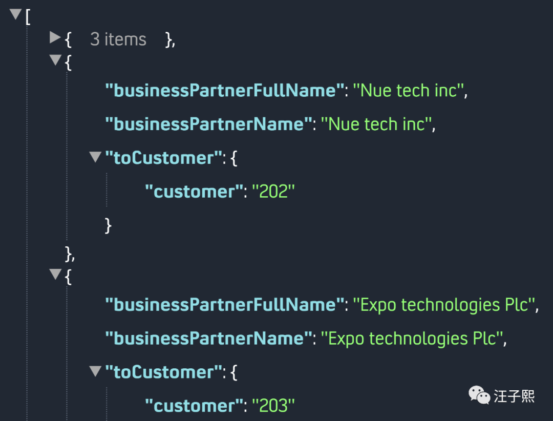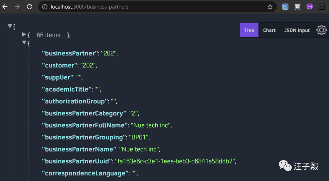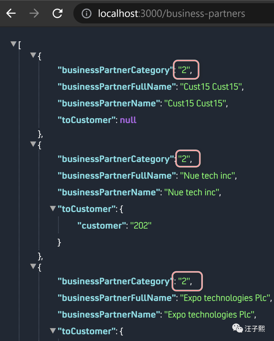 在浏览器里测试,能够成功取回两条 Business Partner 数据: