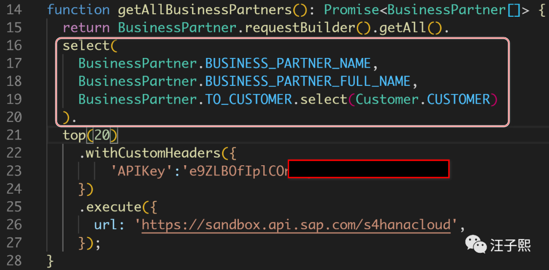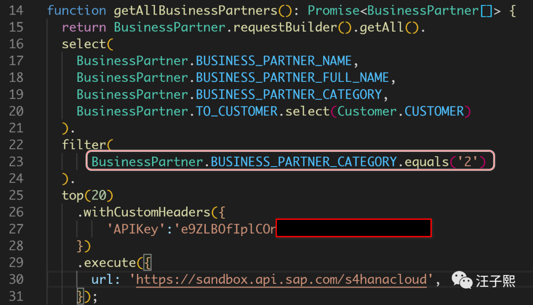 下图代码的含义,代表只返回 BusinessPartnerCategory 字段值为 2 的前20条 BusinessPartner 数据: