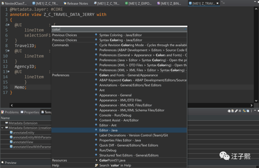 假设我想打开 ABAP Development Tool 和颜色 (color) 相关的设置,但是我记不住具体的设置路径了,没有关系,使用快捷键 Ctrl + 3: