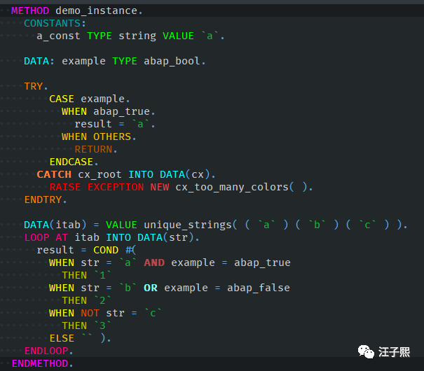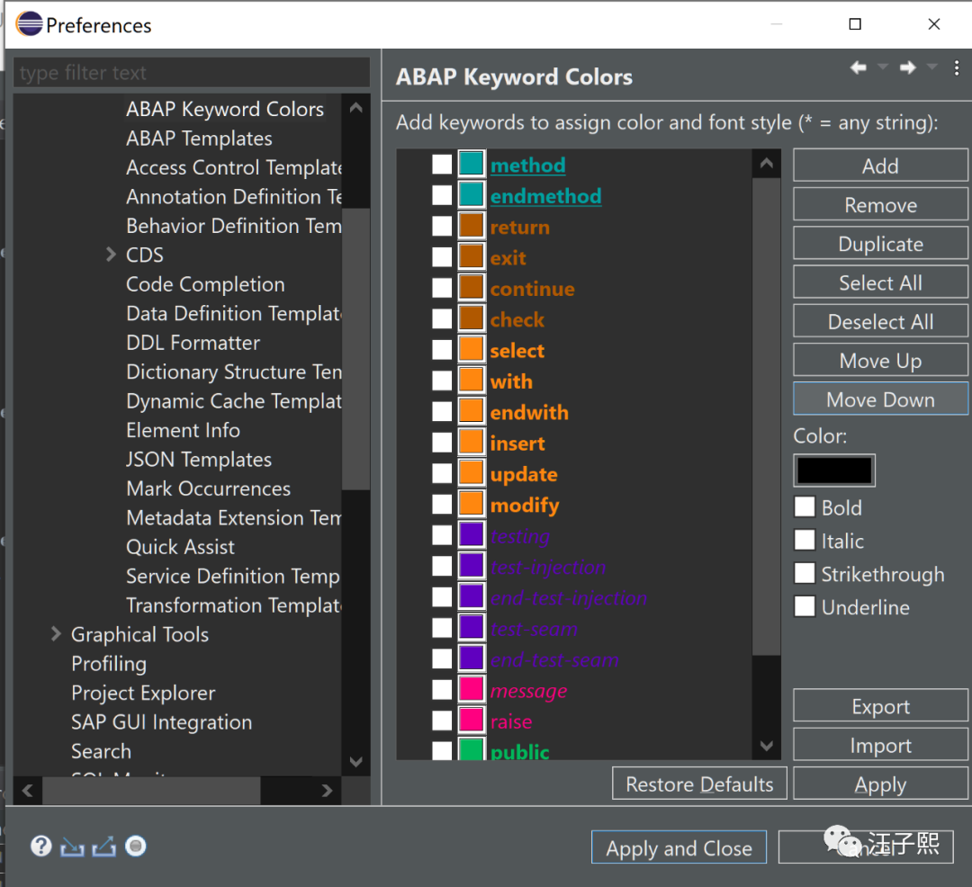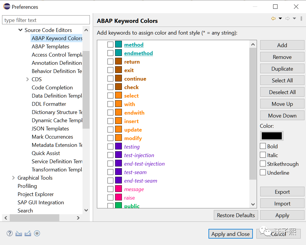 Visual Studio Code 需要安装额外的扩展才能实现这个颜色更改需求,而 ADT 本身的设置就足以工作了,相当赞。如果需要整天面对 ABAP 代码,那么将其外观设置得五彩缤纷一点,或许也能让自己编程时,心情更加愉悦一些。
