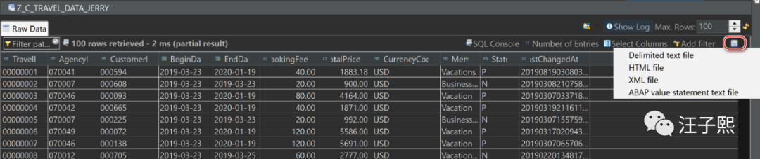CDS view 数据预览之后,可以通过 Add filter 右边这个小图标,以不同的格式另存到本地以便进一步分析。