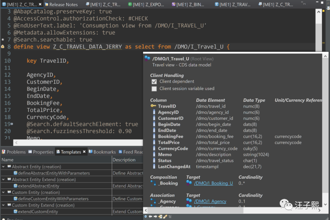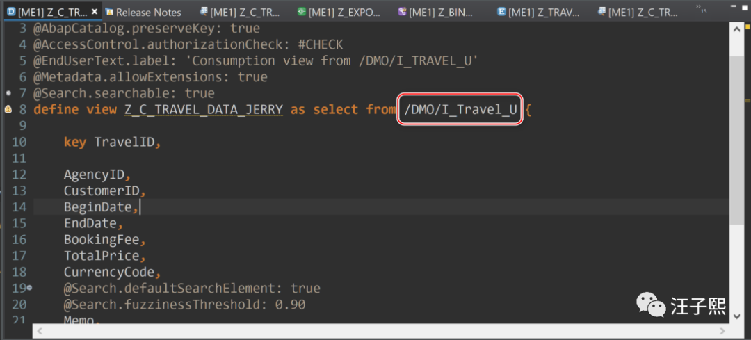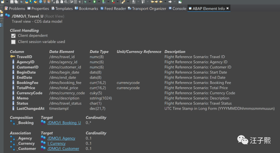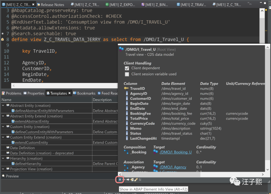 例如我们想查看标准视图 DMO/I_Travel_U 的明细,无需打开其视图本身。