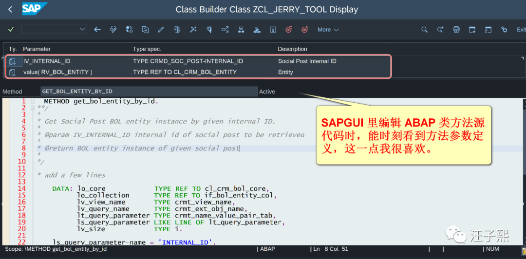 SAPGUI 里能在编写 ABAP 类方法源代码实现时,随时查看其方法参数定义,这一点我很喜欢。