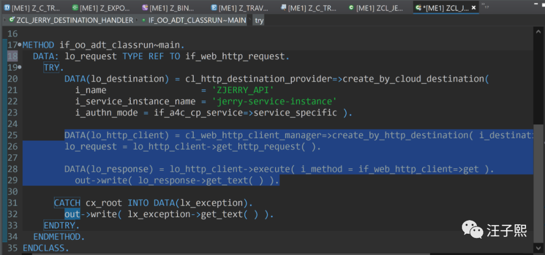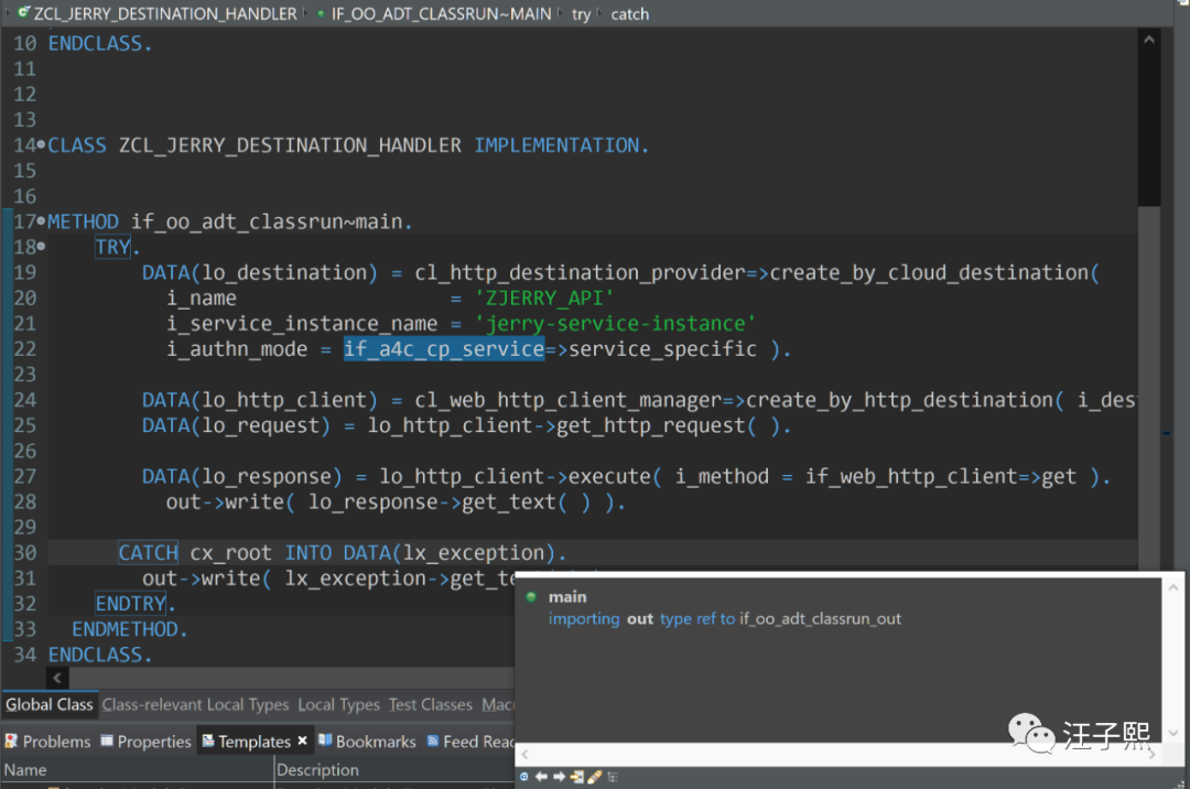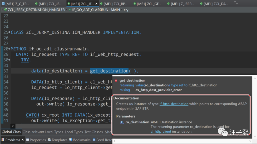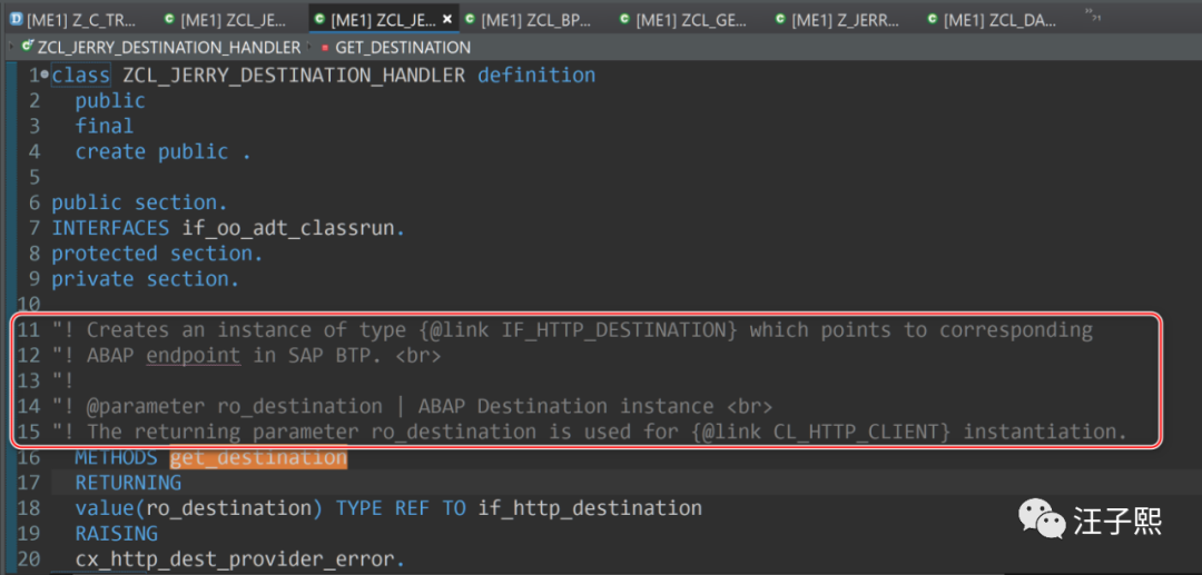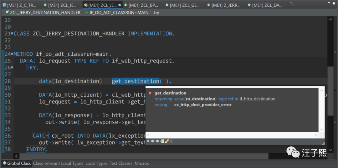 选中下图第28行的方法调用 get_destination, 按 F2 之后,显示的是 SAP ABAP Development Tool 里默认的方法参数说明。