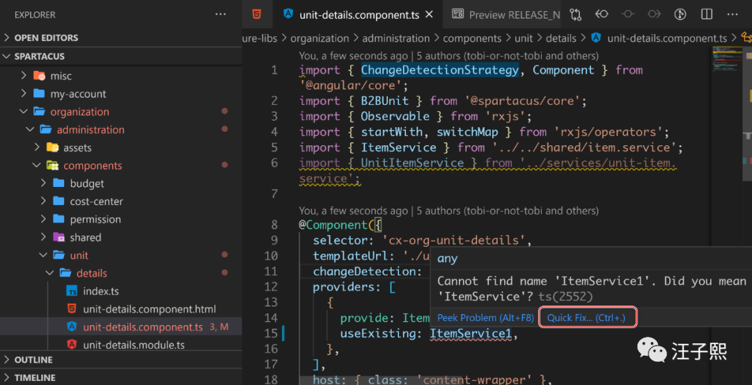 我用了快一年的 Visual Studio Code 进行 Angular 开发了,真心喜欢其 Quick Fix 功能, 编译器能通过上下文,自动给出一些编译错误的解决方案。