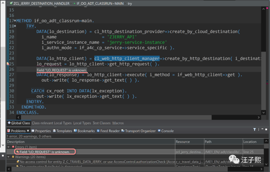 ABAP Development Tool 里也有类似功能。比如下面的例子,代码第25行,变量 lo_request 没有定义就直接使用,引起了一个编译错误。