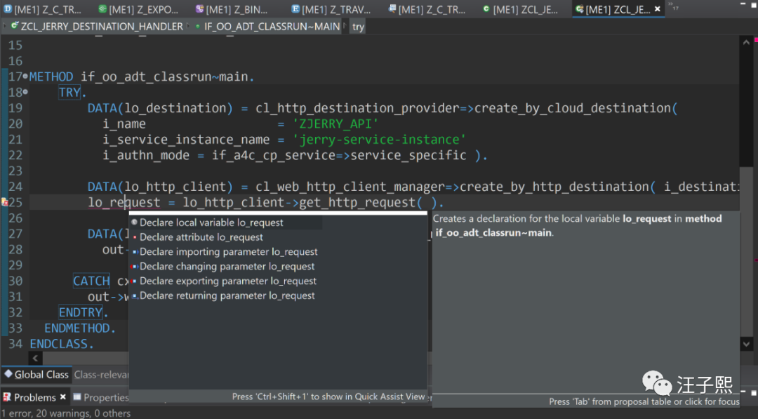 选中 lo_request, 快捷键 Ctrl + 1,即可看到 ABAP 编译器给出修复该语法错误的几种建议,这称之为 ADT Quick Assistant.