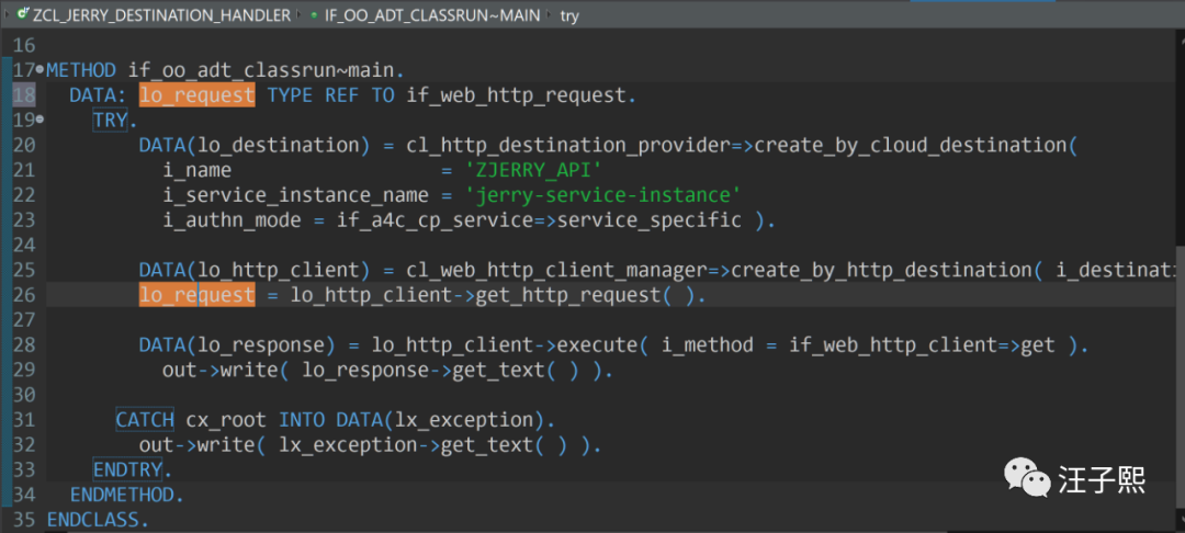 这里选择第一条建议即 Declare local variable lo_request, 双击,定义局部变量 lo_request 的代码就自动插入到指定的位置了:
