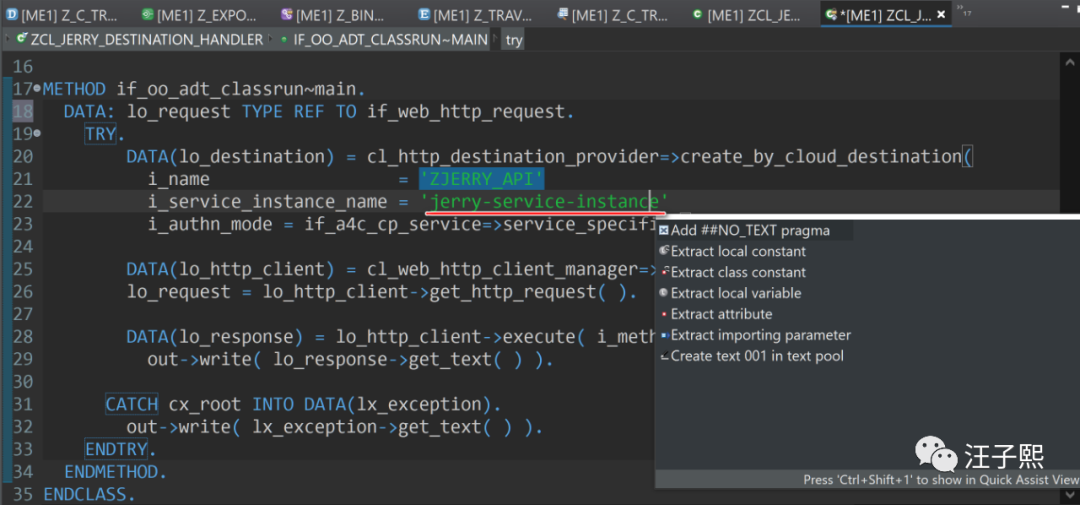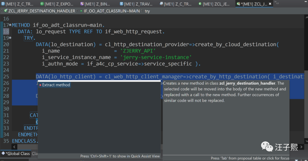 根据不同的选中上下文,Ctrl + 1 的行为也不同。比如同时选中 ABAP 方法内的若干行代码,再按 Ctrl + 1,弹出的则是代码重构的一些建议,比如将这些选中的代码,抽取到一个新的私有方法去。这种代码重构方式称之为 Method Extraction.
