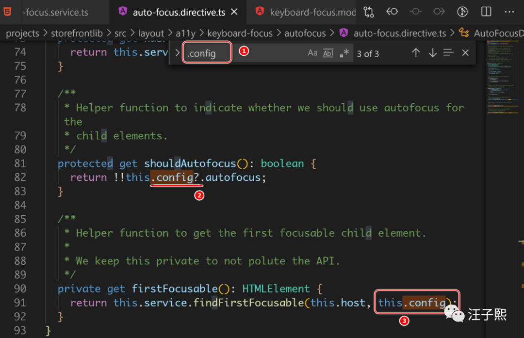 以 Visual Studio Code 为例,假设我想查看名为 config 的属性在 Component 里所有的出现场景(Occurances), 需要 Ctrl + F 打开搜索框,输入 .config. 这样,代码中所有出现 .config 的位置,会被高亮显示。