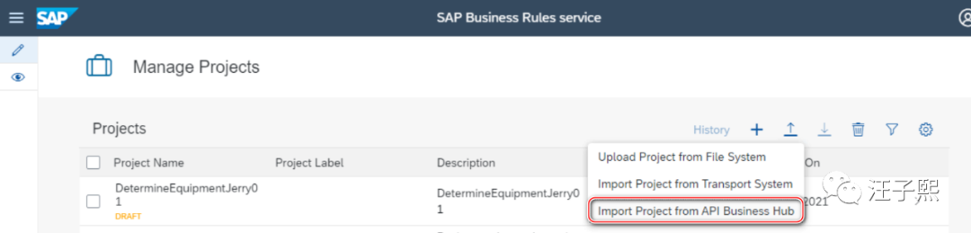 进入 Manage Projects 应用,选择 Import Project from API Business Hub: