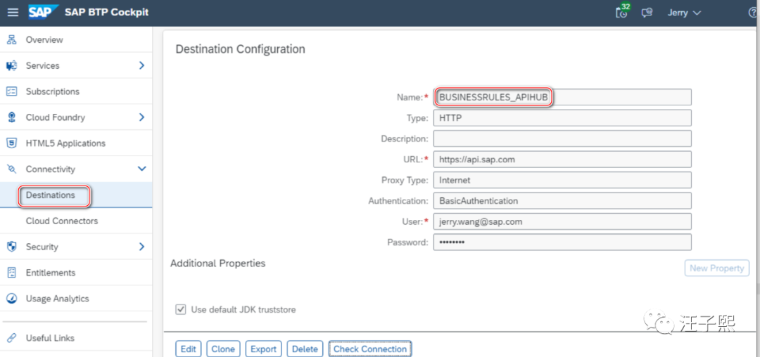 要从 API Business Hub 导入内容到 SAP BTP,需要首先在 SAP BTP 配置一个指向 API Hub 的逻辑系统,命名为 JerryAPIHub,包含一个 Destination: