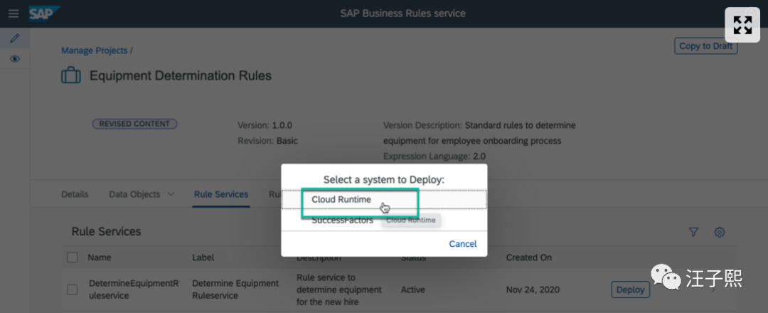 导入该 Rules 后,将其部署到 Cloud Runtime,这样其才能被本文后续创建的 Workflow 应用,通过 HTTP POST 方式消费。
