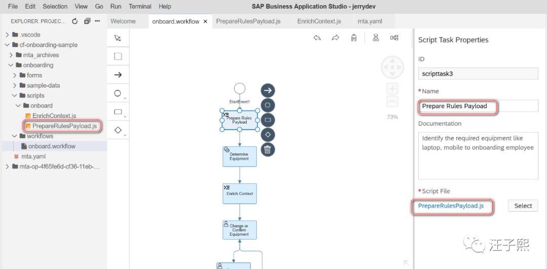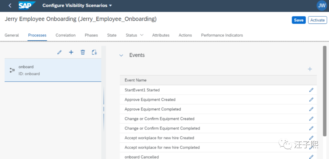 将我们之前导入到 SAP Business Application Studio 里的 id 为 onboard 的 Workflow 模型,导入到这个 Scenario 里来,能看到其步骤内所有的事件和上下文。