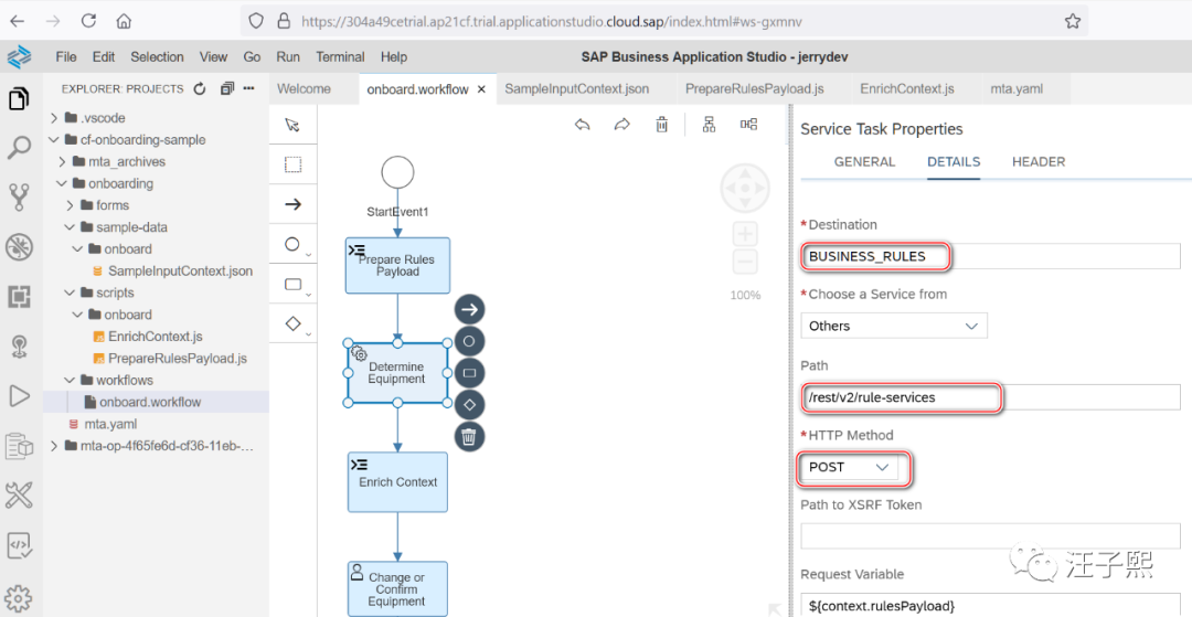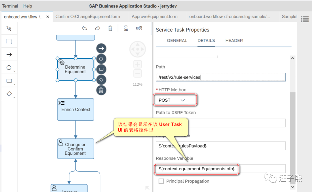 这背后其实发生了很多事情:Workflow 应用里 Determine Equipment Service Task 得到执行,通过 HTTP POST,消费部署在 SAP BTP 上的 Business Rules Service,后者根据我们在 Start New Instance 里传入的 Sample Data,返回自动决定出的设备明细。
