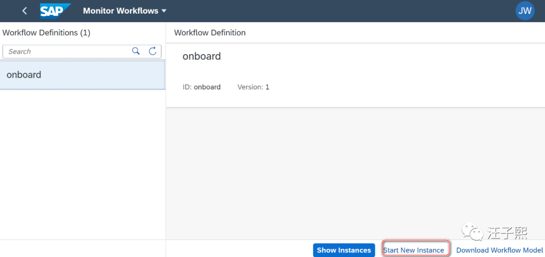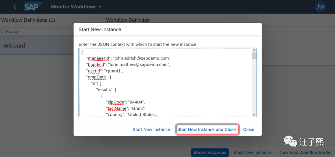 所以每当创建新的 Workflow 实例时,其输入数据可以从 Sample Data 里自动带出来。选择 Start New Instance and Close: