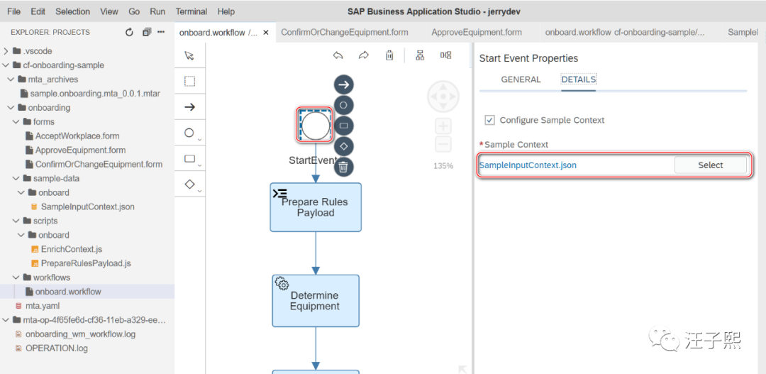因为之前我在 SAP Business Application Studio 里进行 Workflow 建模时,曾经指定其 Start Event 支持 Sample Context,并配置了一个 json 文件作为 Sample Data: