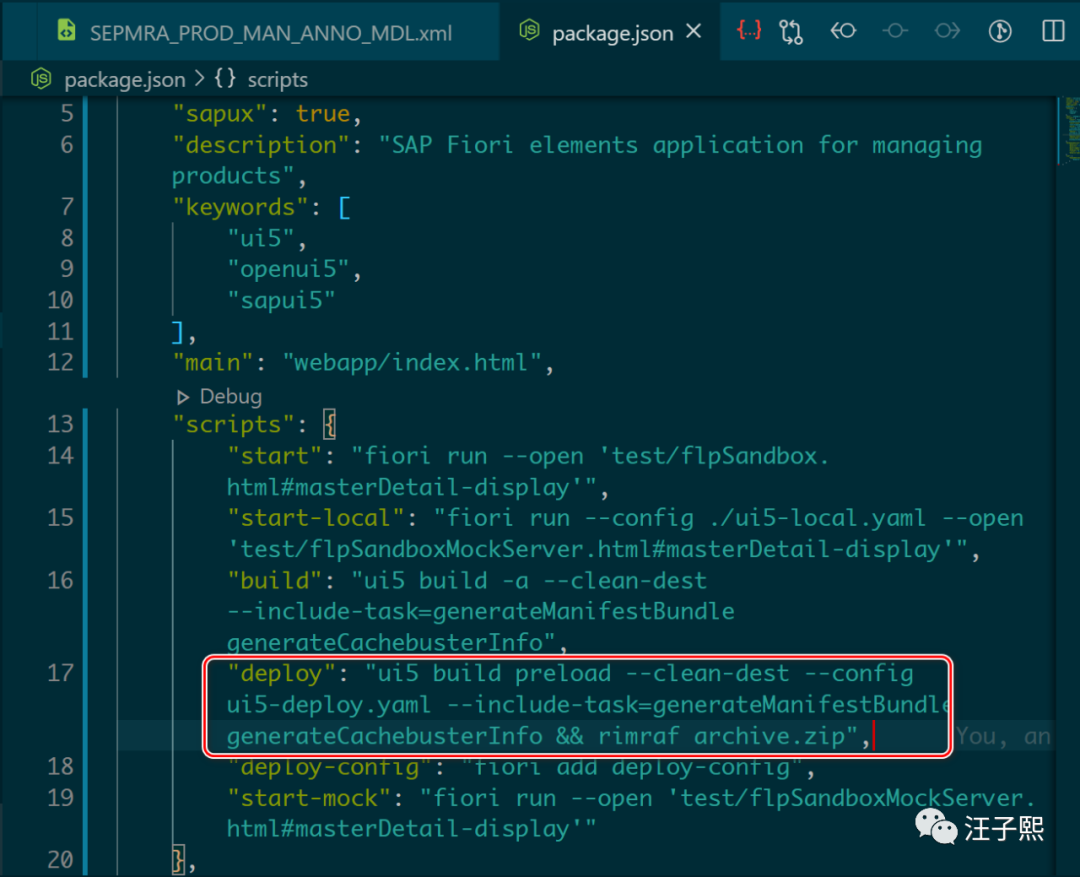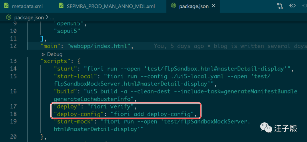 npm run deploy-config 命令执行完毕后,生成了对应包含部署明细信息的 ui5-deploy.yaml 文件,同时 package.json 文件里,deploy 命令的内容,也从之前的 fiori verify,自动替换成了如下内容: