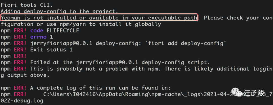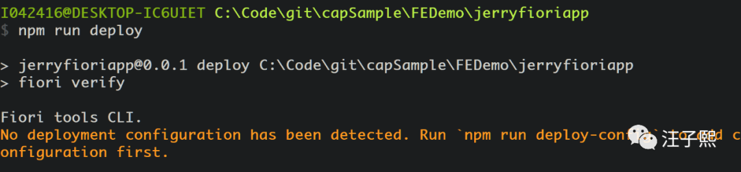 先执行 npm run deploy 命令,这条命令的内容是 fiori verify,即进行部署前的校验工作。校验的结果,在本地检测不到部署配置信息,这样 Visual Studio Code 里安装的 SAP Fiori tools, 根本不知道开发人员期望将该应用,部署到哪个 ABAP 服务器上。