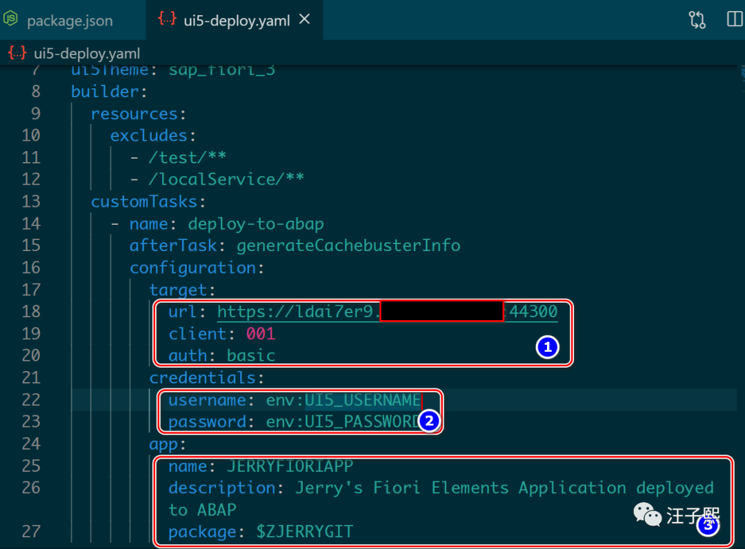 下图是我修改过的 ui5-deploy.yaml 文件。整个文件由 SAP Fiori tools 自动生成,我们只需要修改图中 1~3 区域的内容。