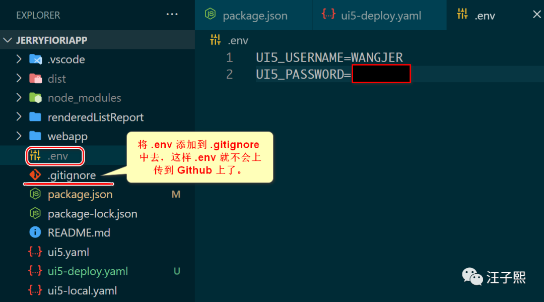 2. credentials 区域,维护我登录 ER9/001 的用户名和密码。因为该 yaml 文件需要上传到 Github 上进行版本管理,故不应直接维护用户名和密码等敏感信息,而是将这些信息维护到一个叫做 .env 的文件里,然后在 ui5-deploy.yaml 里引用该 .env 文件。
