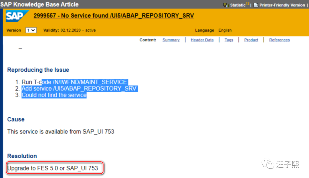 注意,该 OData 服务仅在 SAP_UI 753 及其以上的版本才可用。