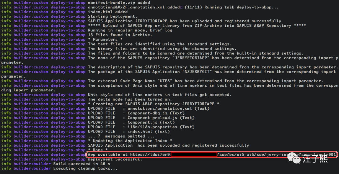 npm run deploy 命令执行成功后,命令行会打印出部署到 ABAP 服务器上的 SAP Fiori Elements 应用可供访问的 url: