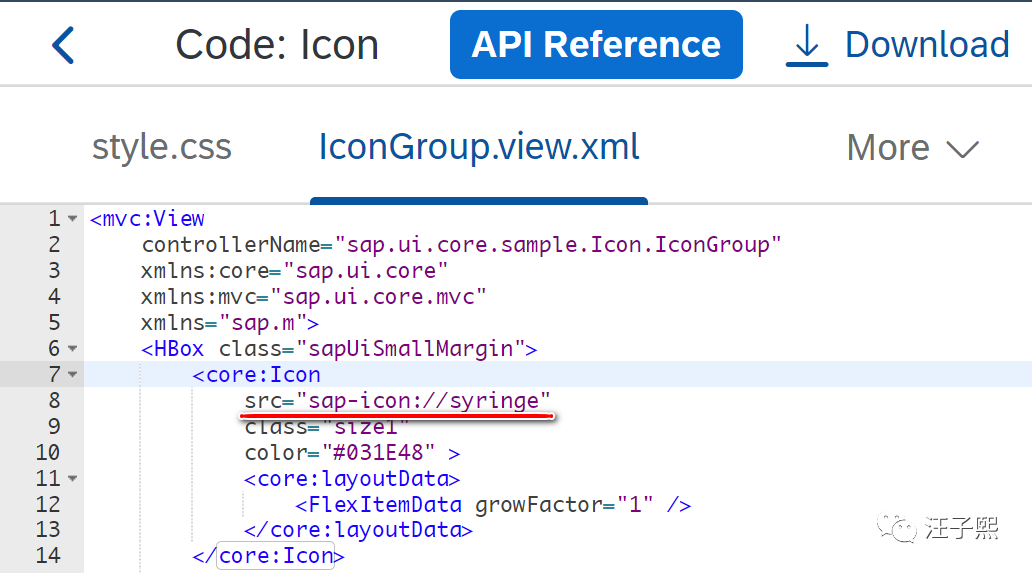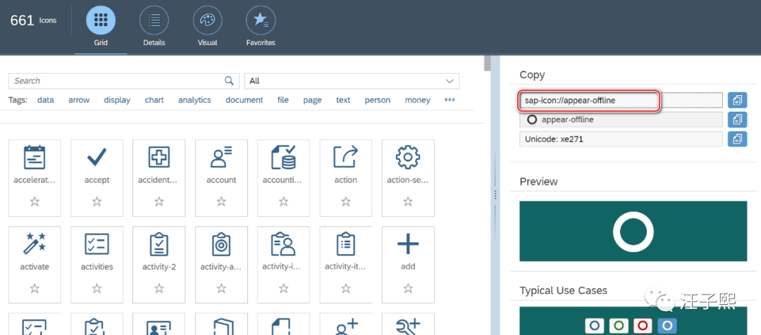 在右边明细页面,就能找到其 sap-icon:// 值: