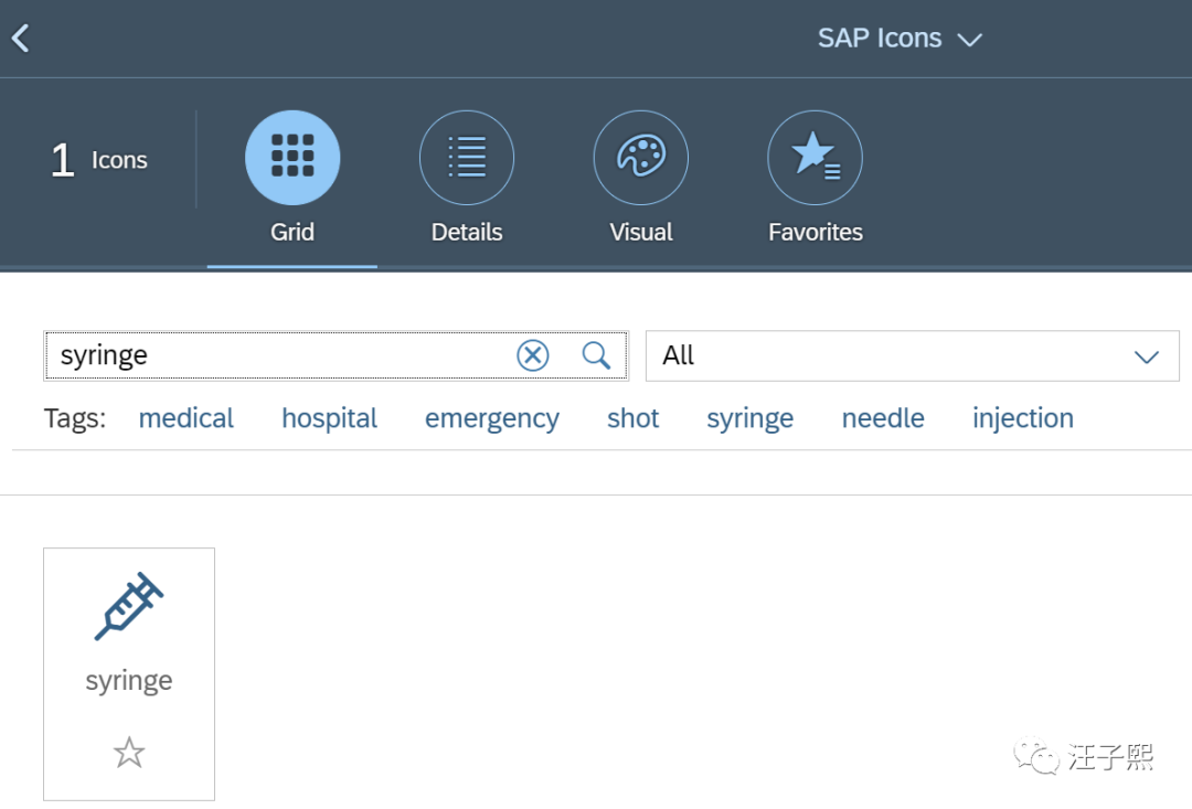 比如 sap-icon://syringe 对应下图这个注射器图标。至于运行时,Icon 控件 src 属性值对应的图案是如何被渲染出来的,该技术细节由 SAP UI5 框架去实现,一般的 SAP UI5 应用开发人员无需了解。