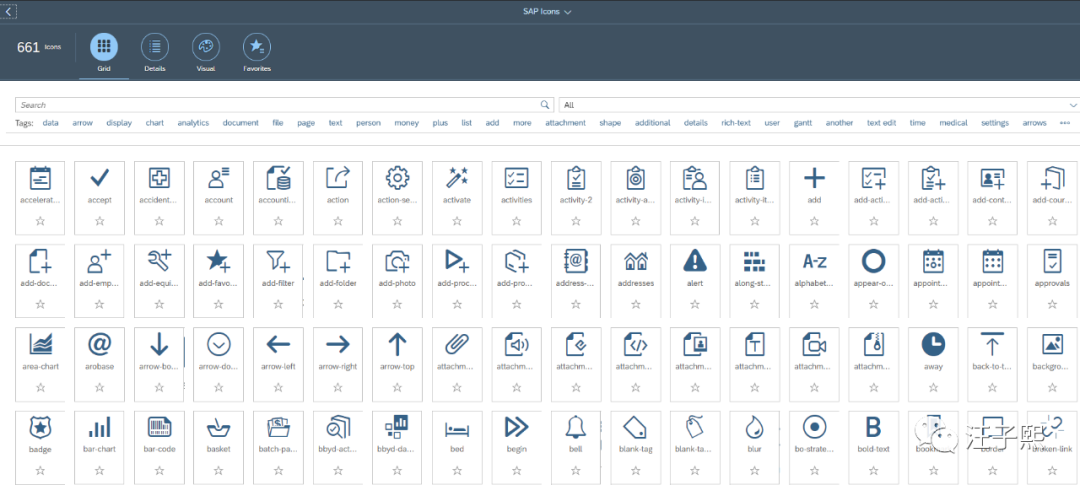 SAP 发布了六百多种标准的图标,能直接在 Fiori 应用中使用。这些图标能够在一个称为 SAP Icon Explorer 的网页中统一浏览。