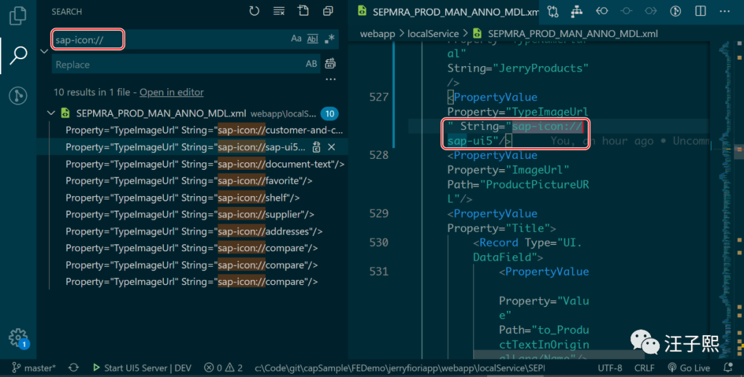 使用 Visual Studio Code 等编辑器打开 SAP Fiori 应用的源代码,搜索关键字 sap-icon:// , 则编辑器会列出该 Fiori 应用使用到的所有图标的 sap-icon:// 值。