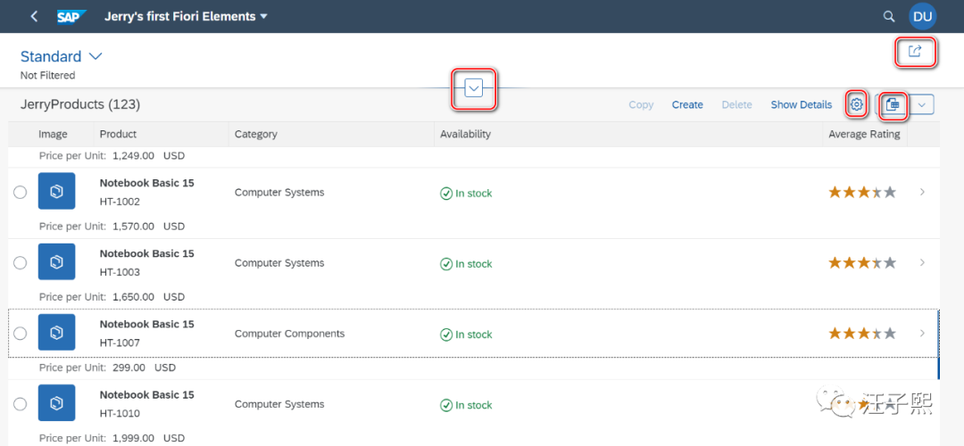 以下图为例,该应用通过 SAP Fiori Elements 开发而成,图中高亮的几个图标,是 SAP Fiori Elements List Report 模板内定义的标准图标,并没有包含在 Fiori 应用开发人员通过 Application Generator 创建出来的本地工程文件里。因此这些图标对应的 sap-icon:// , 根本无法通过本地工程源代码搜索的方式获得。