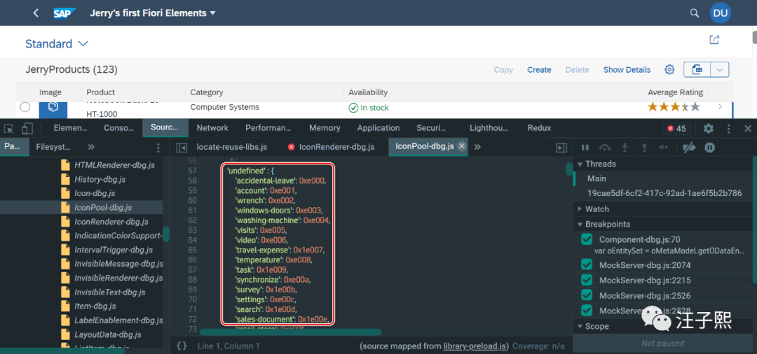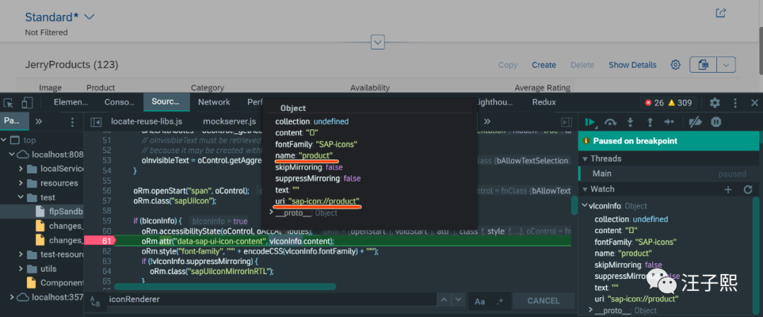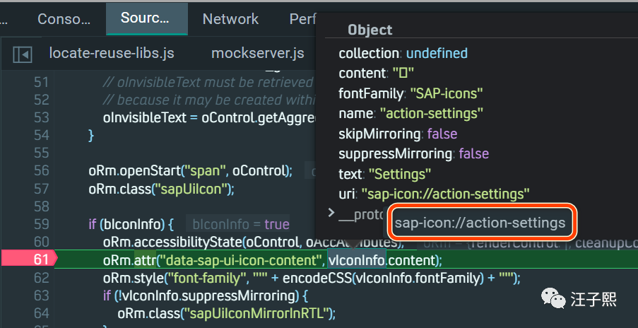 运行时断点触发,第61行变量 vIconInfo里包含的 uri 字段的值,即是我们要找的 sap-icon://product.