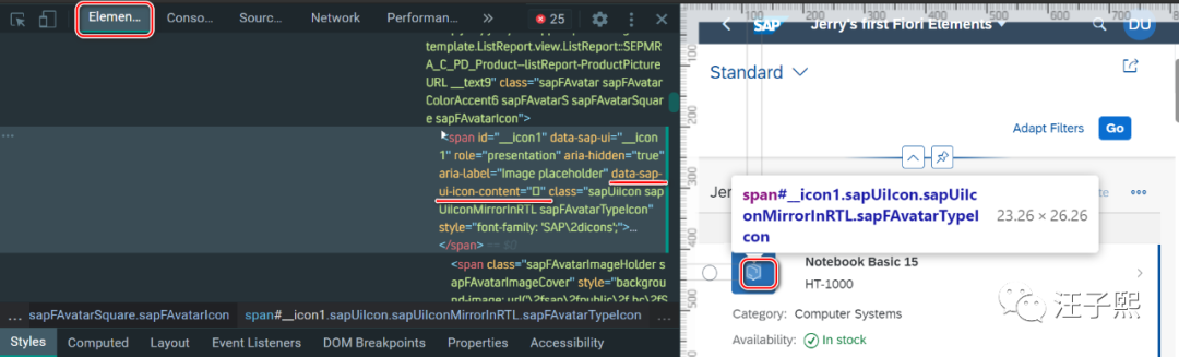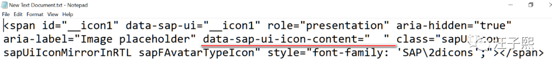 在 Chrome 开发者工具的 Elements 标签页里,找到 Icon 控件最终渲染出来的 span 元素,发现其 data-sap-ui-icon-content 的值,显示为一个普通用户不可读的小方框。