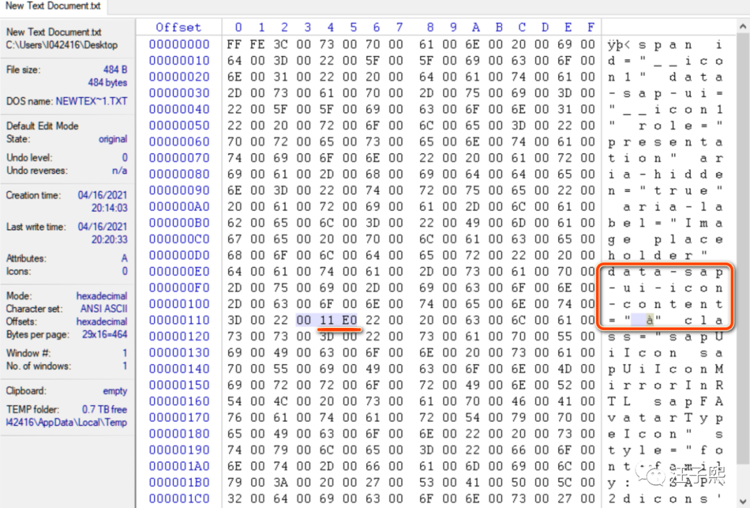 用 UltraEdit 或者 WinHex 之类的工具软件,打开之前以 UTF-16 另存的记事本文件。找到之前在浏览器和记事本里,均无法正常显示的 data-sap-ui-icon-content 属性值,其 Unicode 为 E011.