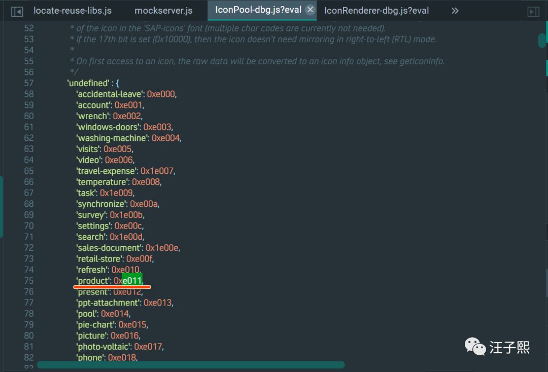 还记得方法 3 里提到的 Icon 控件的渲染器 IconRenderer.js 么?在它的旁边就是 IconPool.js,该文件里硬编码了 SAP Fiori 支持的所有标准图标的名称,及其对应的 Unicode 值。