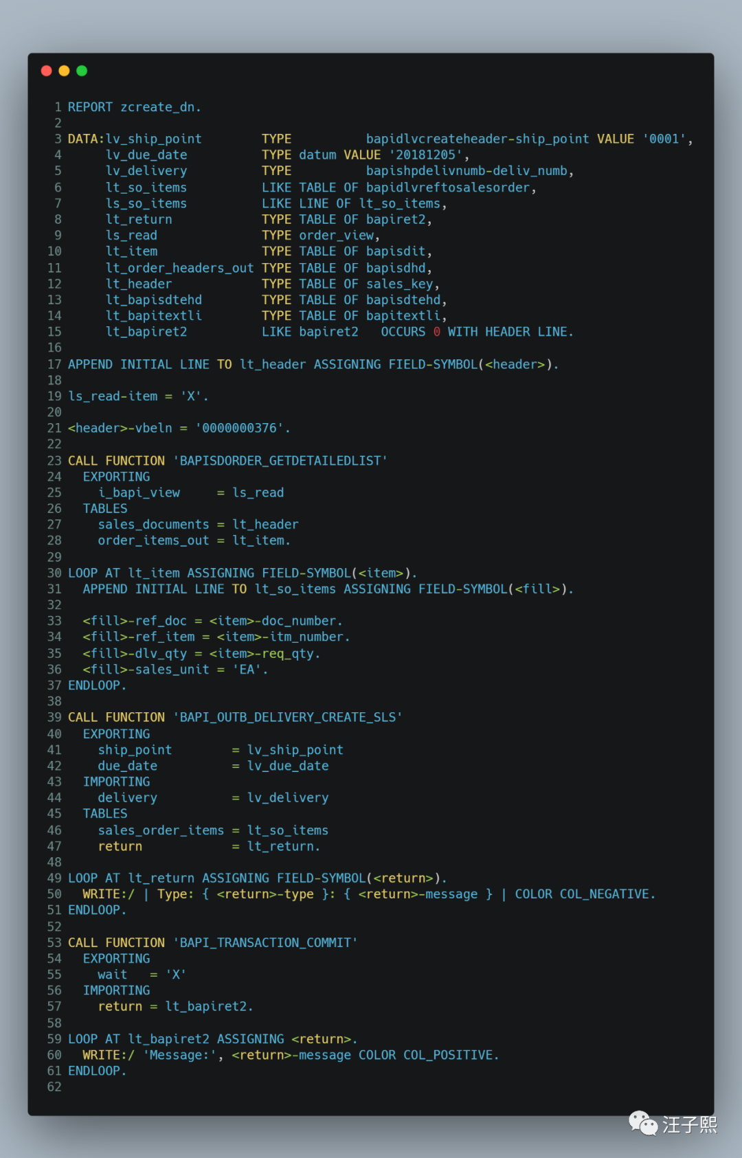 很快写好了一个 report:在第21行硬编码了一个 SAP Cloud for Customer 的销售订单 ID,测试后发现没什么问题,将这个报表的源代码拷贝到一个新的 ABAP Class 里,稍作修改,将硬编码去掉,替换成从 SAP Cloud for Customer 传过来的销售订单 ID 即可。