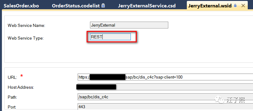 Web Service 名称取为 JerryExternal,类型为 REST. URL字段,填充成 S/4HANA API 的 url.