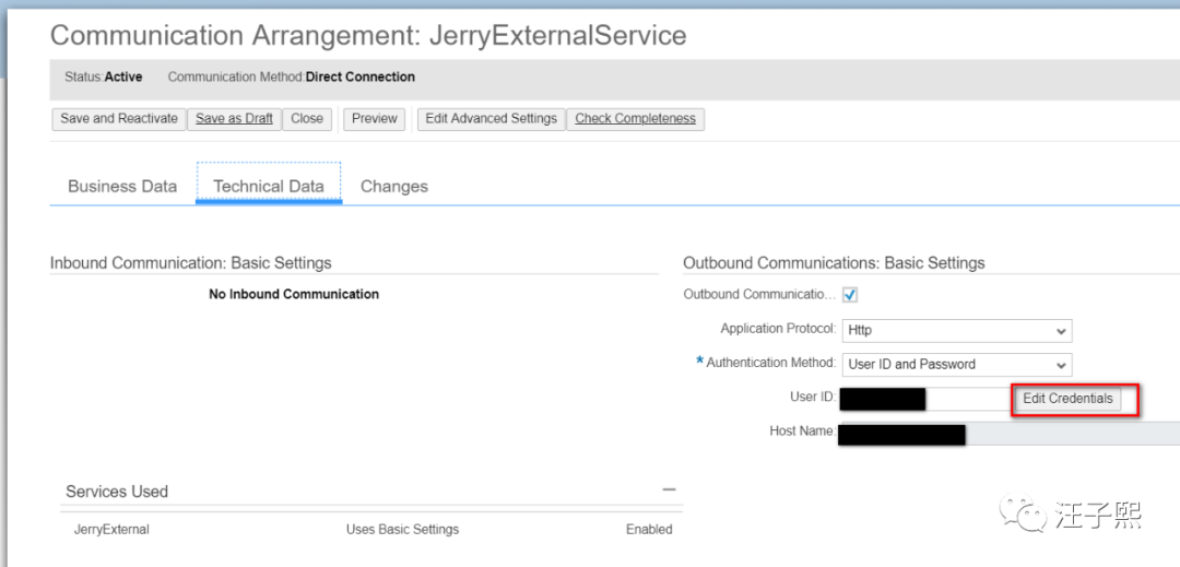 将访问 S/4HANA API 所需的用户名和密码,维护到新建的 Communication Arrangement 里去: