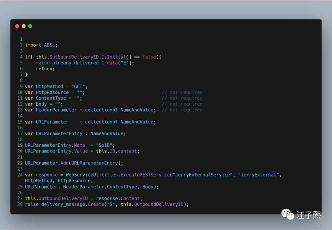 从上图 ABSL 实现代码,我们也能体会到 SAP 引入 Communication Scenario & Arrangement 这些模型带来的好处: