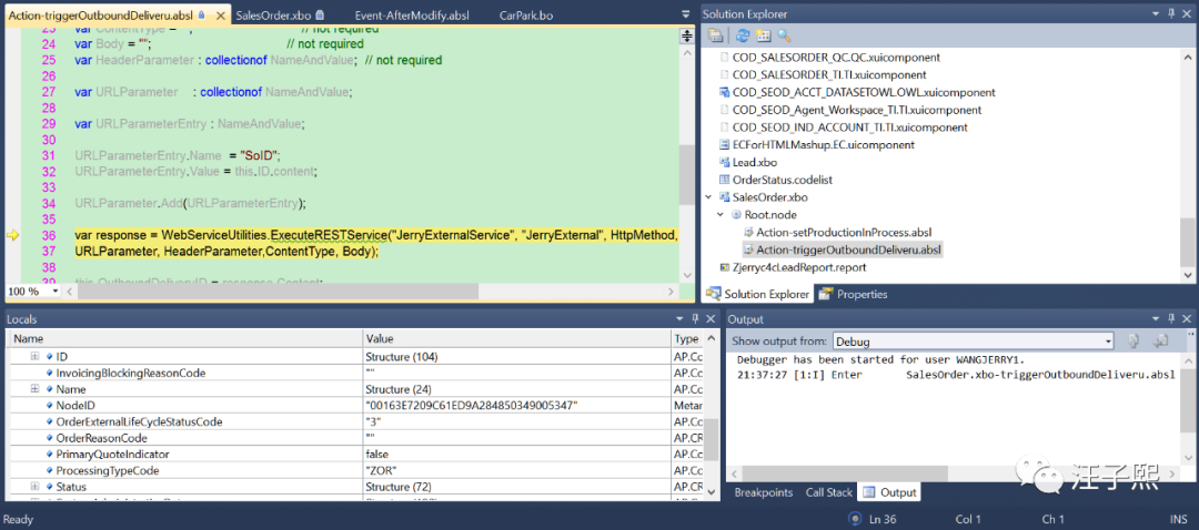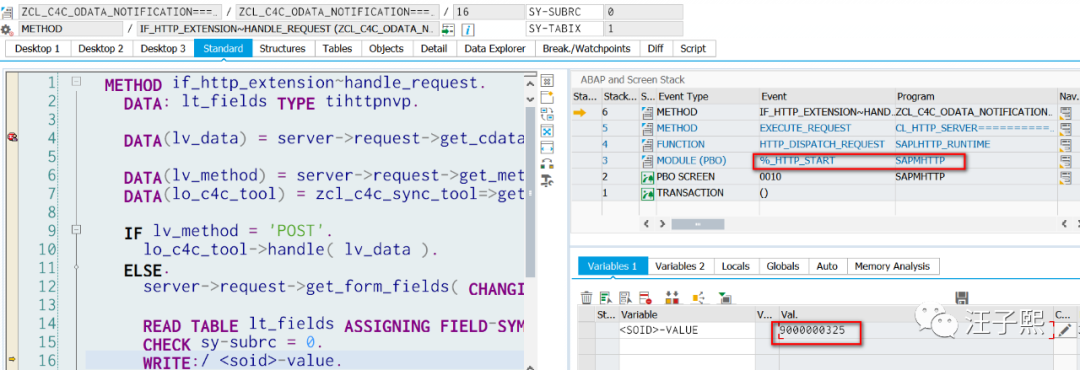 上图是 SAP C4C ABSL 代码的单步调试,点击 Continue 之后,设置在 SAP S/4HANA SICF 实现类里的 ABAP 断点触发,调试器里能看到 SAP C4C Sales Order ID 已经成功传递到 SAP S/4HANA 端了。
