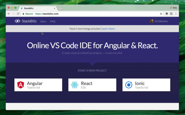 StackBlitz 无需注册,使用 Github 账号即可登录。其界面风格和 Visual Studio Code 极为相似,支持前端三驾马车 Angular,React 和 Vue 项目的创建,包含 Web 项目在线开发,自动管理项目依赖,自动编译,页面效果实时预览等实用功能。