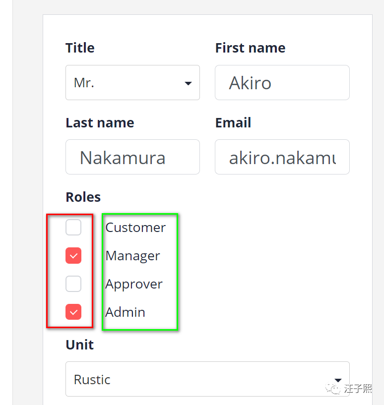 下图是 SAP Spartacus 用户编辑页面,每个用户可以分配若干个角色,除了点击下图红色每种角色对应的圆角正方形框之外,点击绿色的文本框,也需要能选中对应的角色。