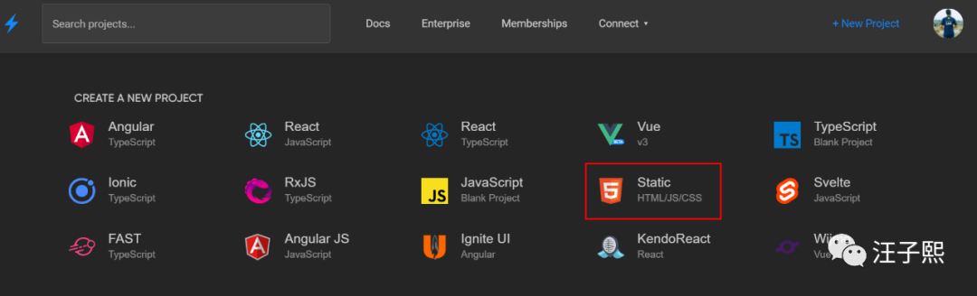 StackBlitz 中新建一个基于 HTML/JS/CSS 的 Static 项目: