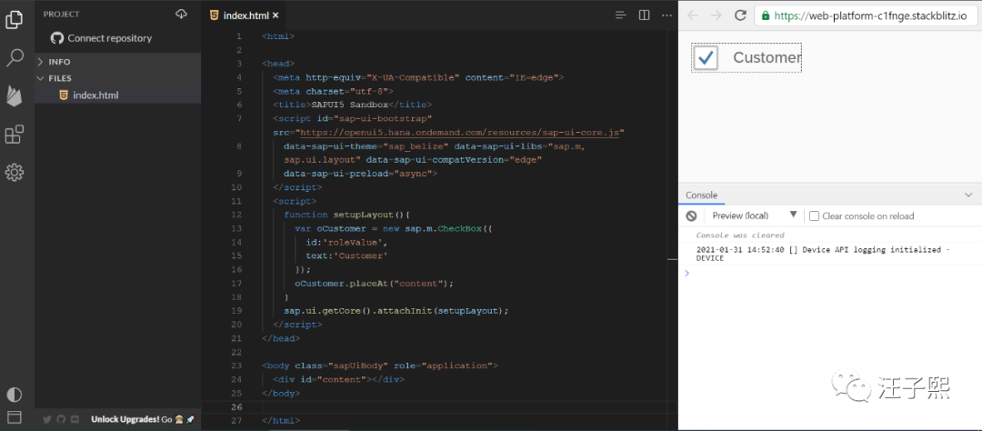 StackBlitz 能否作为 SAP UI5 开发的在线 IDE 呢?Jerry 简单试了试,虽然 StackBlitz 无法像原生支持 Angular,React 和 Vue 那样支持 SAP UI5,但仍然可以用来做一些简单的 SAP UI5 应用的验证工作,比如测试某些 SAP UI5 控件的行为。